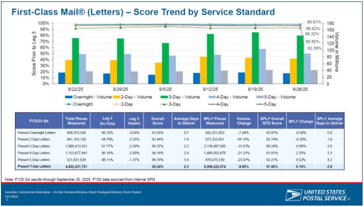 In a session that included a presentation about USPS service performance, the presenter showed charts (like the one above) that, among other data, compared service in late September 2025 to what it was a year earlier.